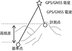 基準点と計測点の高低差が数十mを超えると、伝播速度の遅延による差が無視できなくなり、誤差が大きくなるため、対流圏遅延補正を行う必要があります。
